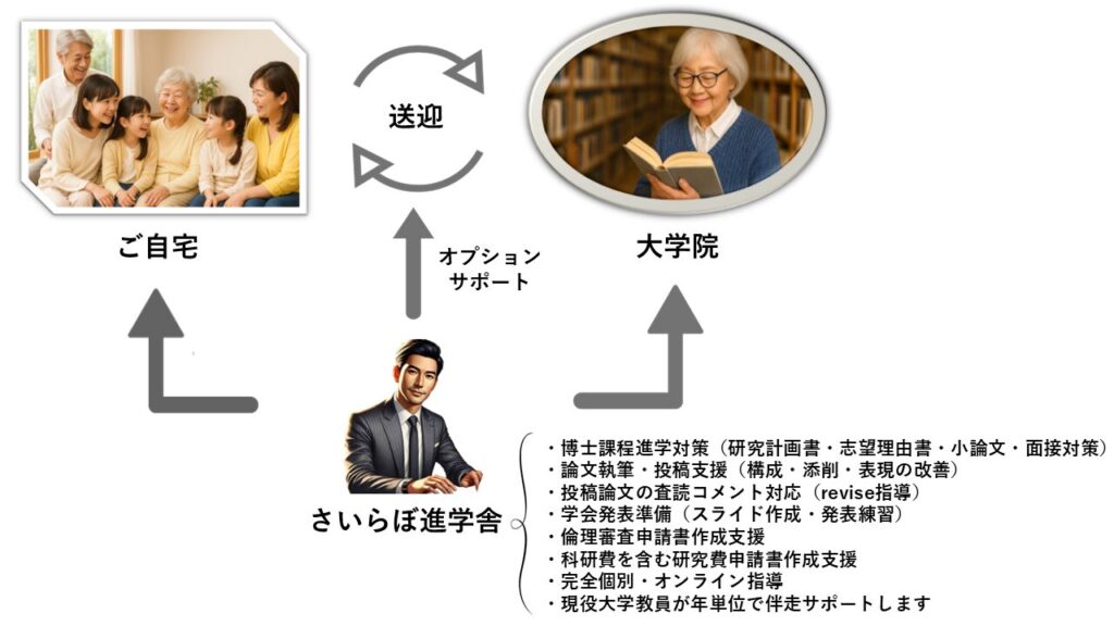 70歳から修士、80歳から博士。研究からスクーリング送迎まで、安心のフルサポート。」