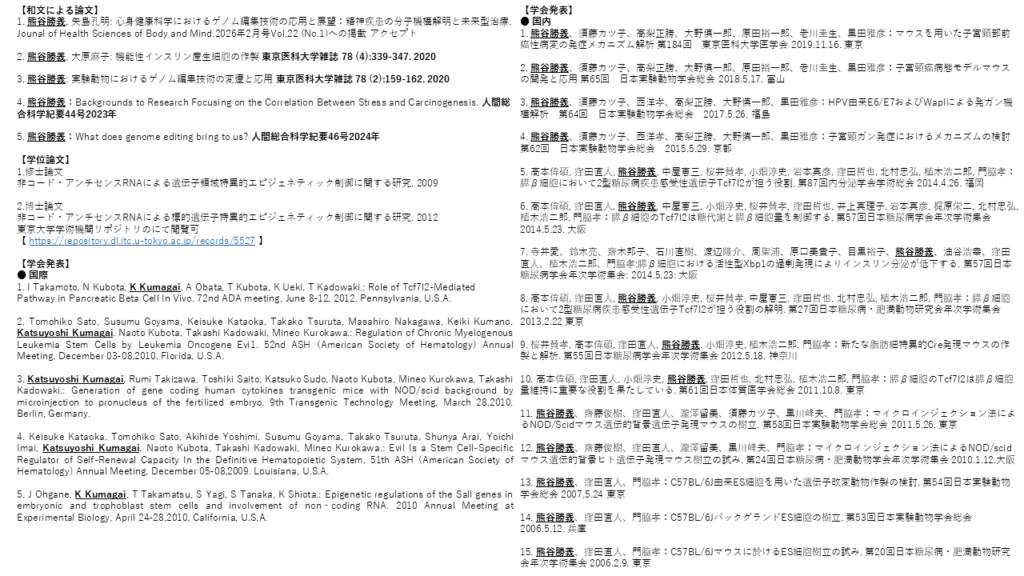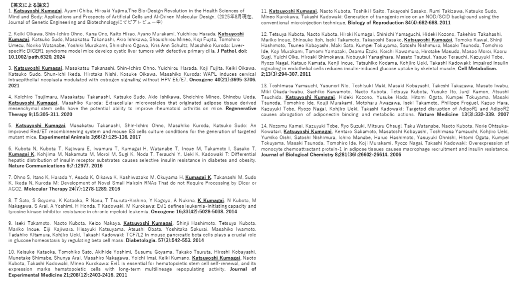 Achievements 2025.08.15 原著論文・研究発表・科研費獲得状況・ピアレビュー担当雑誌 【英文による原著論文】 【和文による原著論文および学会発表】 【研究費獲得状況および担当したピアレビュー雑誌】